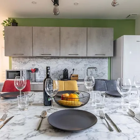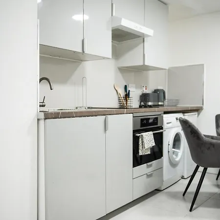 Une cuisine complète à Appartement New F5 Neuf Cosy Lumineux proche siége Michelin comprend un four et un lave-vaisselle. L'arrêt de bus Thevenot Thibaud est à seulement 150 mètres.